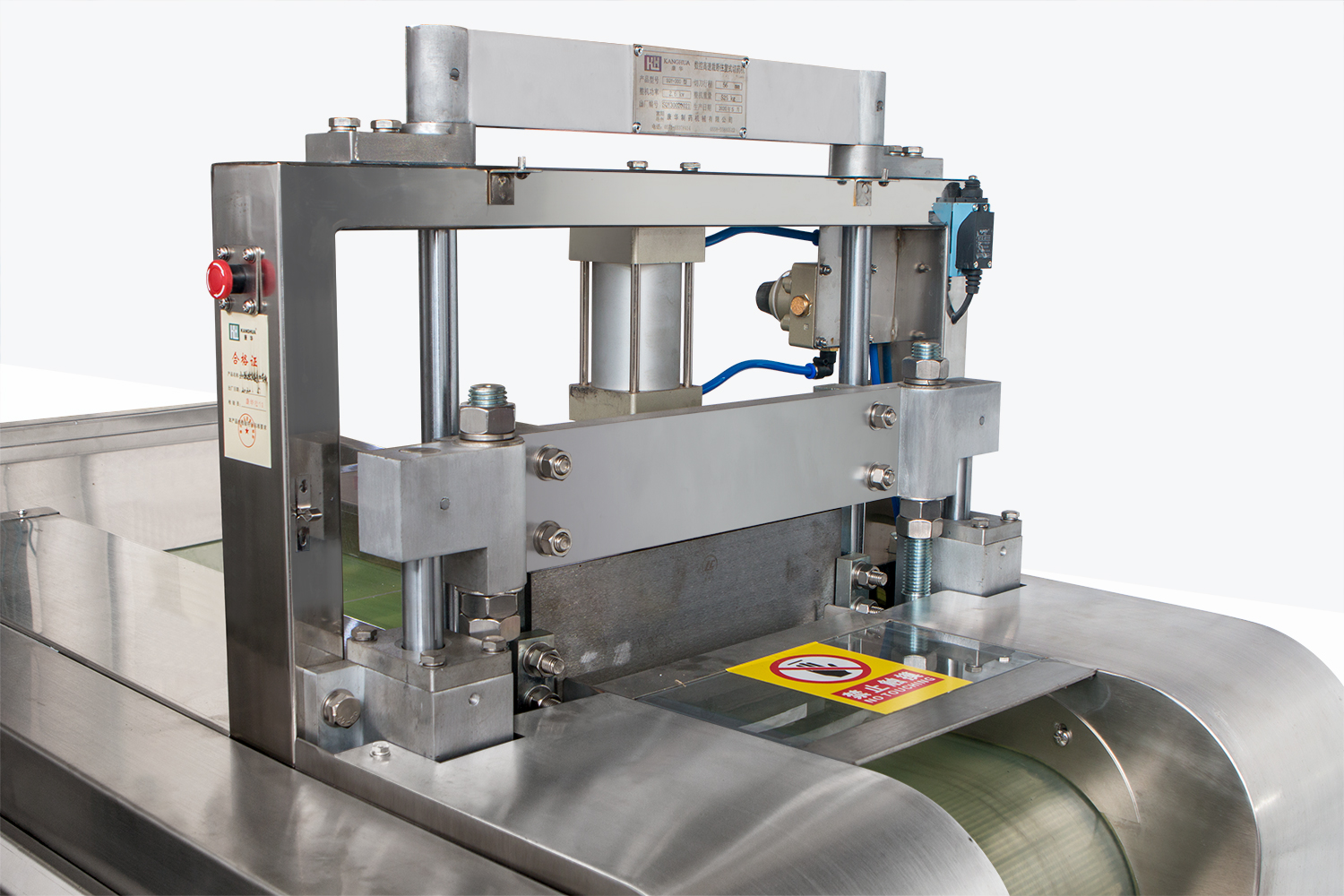 特制的輸送帶和壓料機構將物料按設定的長度,作步進平行移動,垂直上下往復運動的切刀機構直接在輸送帶上切斷物料。